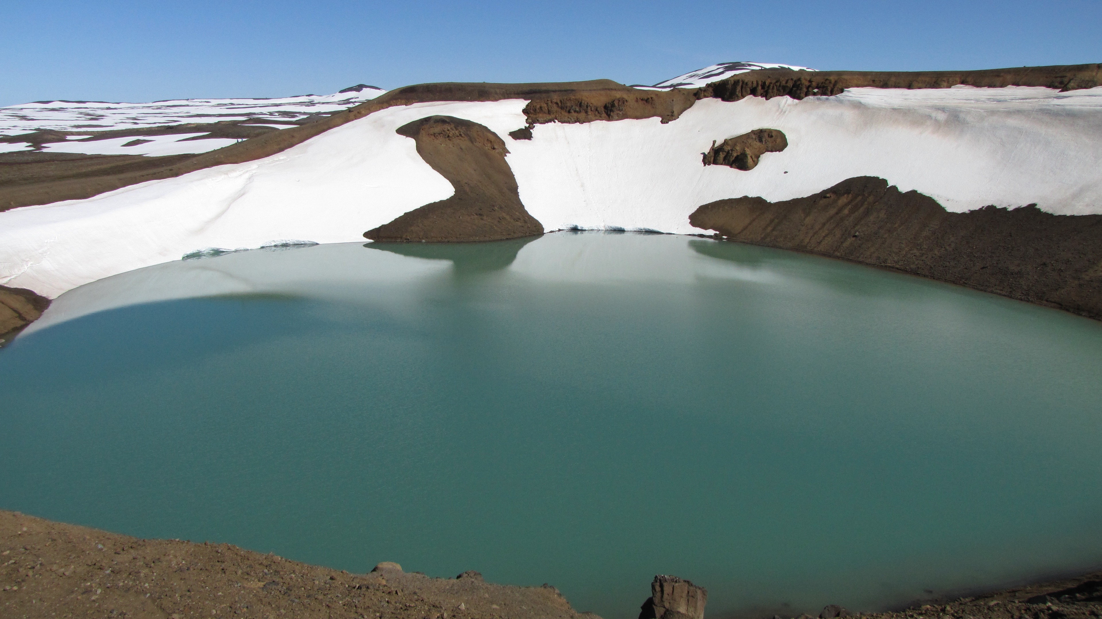 The geothermal area Hverir by Namaskaro (Just 5-10 min from Myvatn) is full of “activity” – complete with steaming fumaroles and bubbling mud pools, much more active than the Geysir area we saw earlier. After spending about an hour walking around there and “soaking in the scenery (along with various gases), we hiked up to a steep hill and got a bird’s eye view of a lot of geothermal activity all around us. Just 10 km from there is the Krafla area of Myvatn, which houses the awesome Viti Crater. Luckily that was right next to the parking lot but was completely worth the minor detour we took. The blue water of the deep crater is an absolutely amazing site. The complete circle walk around the crater takes about 45 minutes and lets you see the crater from all angles possible. A photographer’s delight!