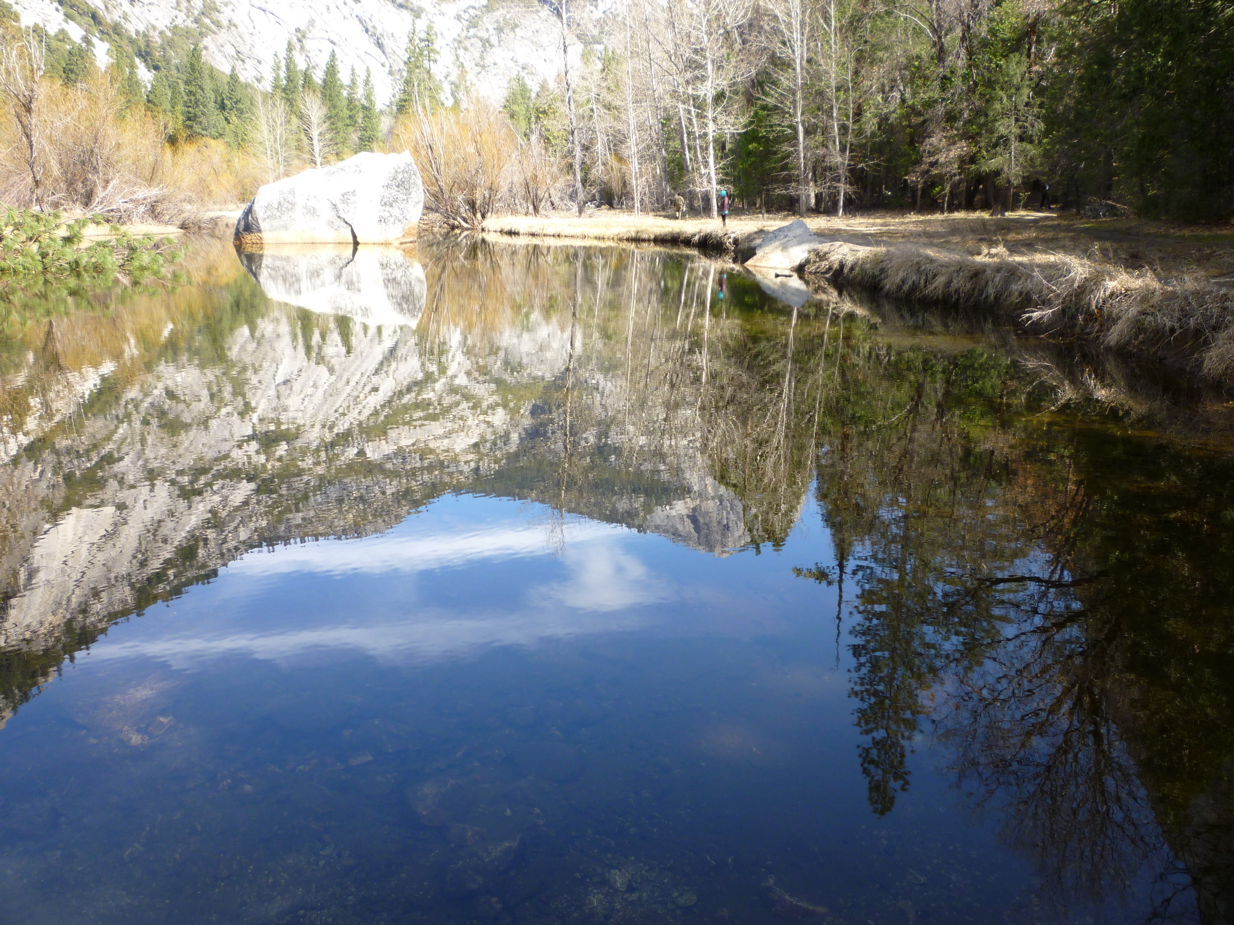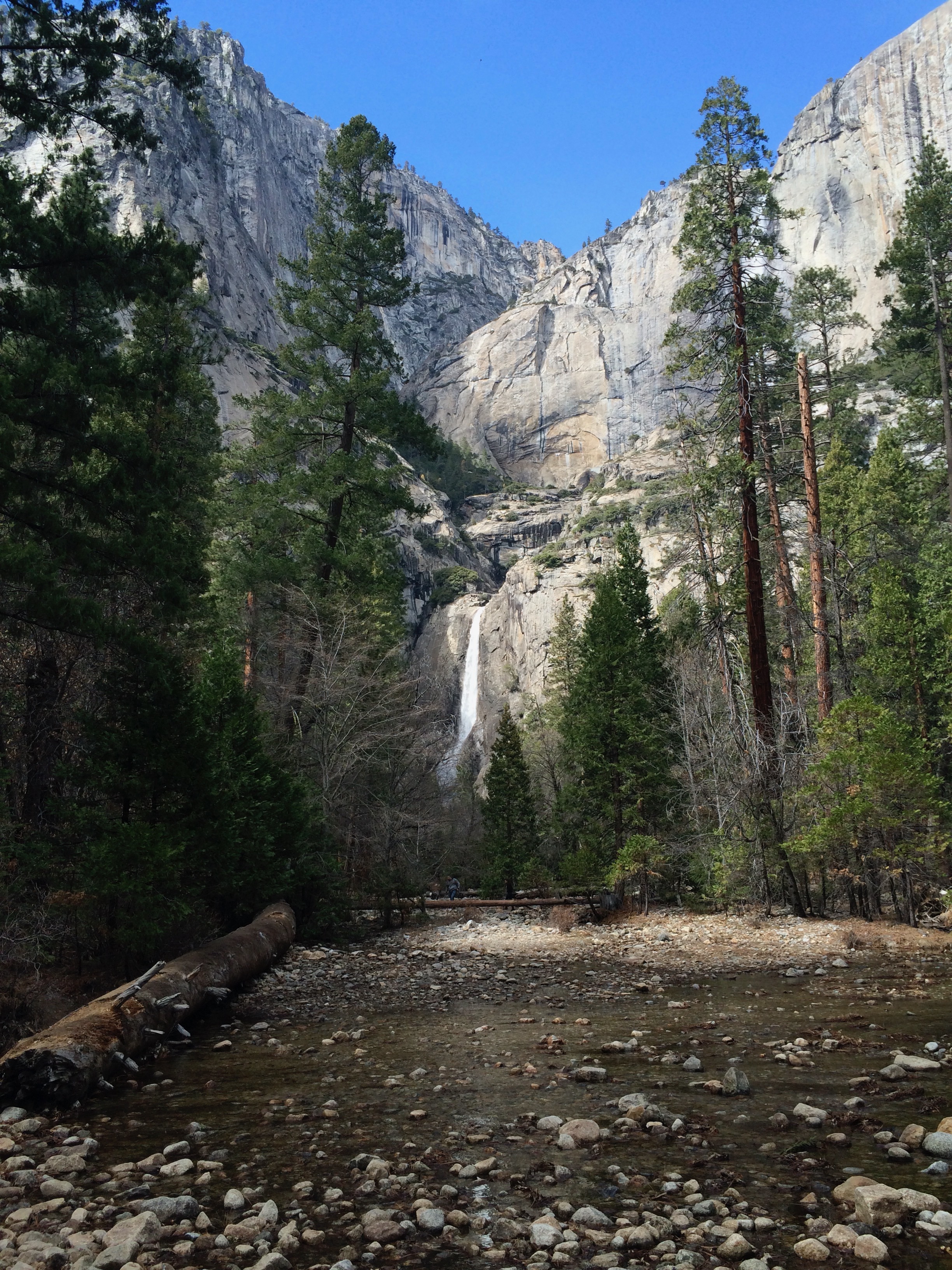 There are several hikes in Yosemite Valley (where most of the action is) – these are rated from easy to moderate to strenuous. For our first full day in Yosemite, we chose an easy and a beautiful hike to Bridal Veil Falls – this was just before the entrance to the main valley. In summers these falls get pretty full of water but since we were there for Spring, there wasn’t much water in the falls yet. It was fun taking a slight detour from the paved pathway, and jumping on large rocks along the creek while taking in the panoramic scenery. The hike was an easy 15 minutes but we may have taken twice the time because of various photo stops we made along the way. Once we reached up by the waterfall, it was very peaceful sitting on the rocks watching the waterfall shimmer down the magnificently large rocks.