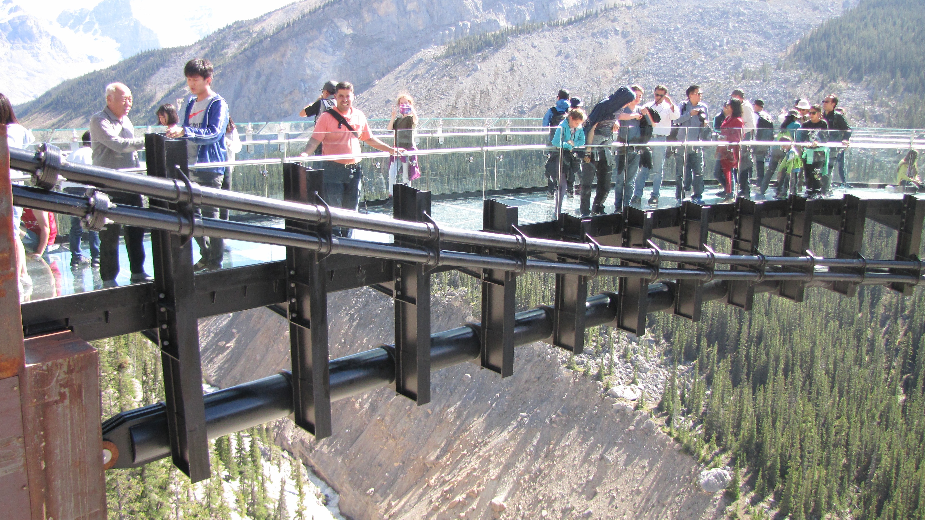With a total area of 200 sq. Kms, the Columbia Icefield is one of the largest masses of glacial ice outside the Arctic circle, surrounded by some of the highest mountains in the Canadian Rockies. The Icefield feeds several large glaciers, including the Athabasca, the Columbia, and the Saskatchewan. The glacier forms breathtaking lakes in a valley abounding alpine wildlife and grand vistas. In recent years, a warmer climate has accelerated the glacial melt and recessions. If this trend continues one day these glaciers will be gone! After a 3-hour drive from Banff, we got to the Icefield Center, the center of all activities. We trekked to the Kitchener Glacier, the origin of the gurgling Sunwapta River. An organized tour activity on a humongous tank-like bus is offered from there that takes visitors atop the Athabasca Glacier, giving all a chance to walk on the glacier, drink pure glacial water from the actual streams, and enjoy the icy nature in abundance. One has to be careful of the several super-dangerous crevices on the glacier. Some markings need to be followed (I know! Because we got yelled at for getting too close to uncharted areas). The drive up and down the glacier is pretty enthralling. Post this 2-hour activity, the bus took us to the Glacier Sky Walk… about 10 minutes from the Center. The small glass-bottom curved cliff-edge walkway sits where glaciers rest above and birds soar below. It was a thrilling experience to see waterfalls, wildlife, canyons, and more standing on a platform where glass is all that separates you from a 918-foot drop.