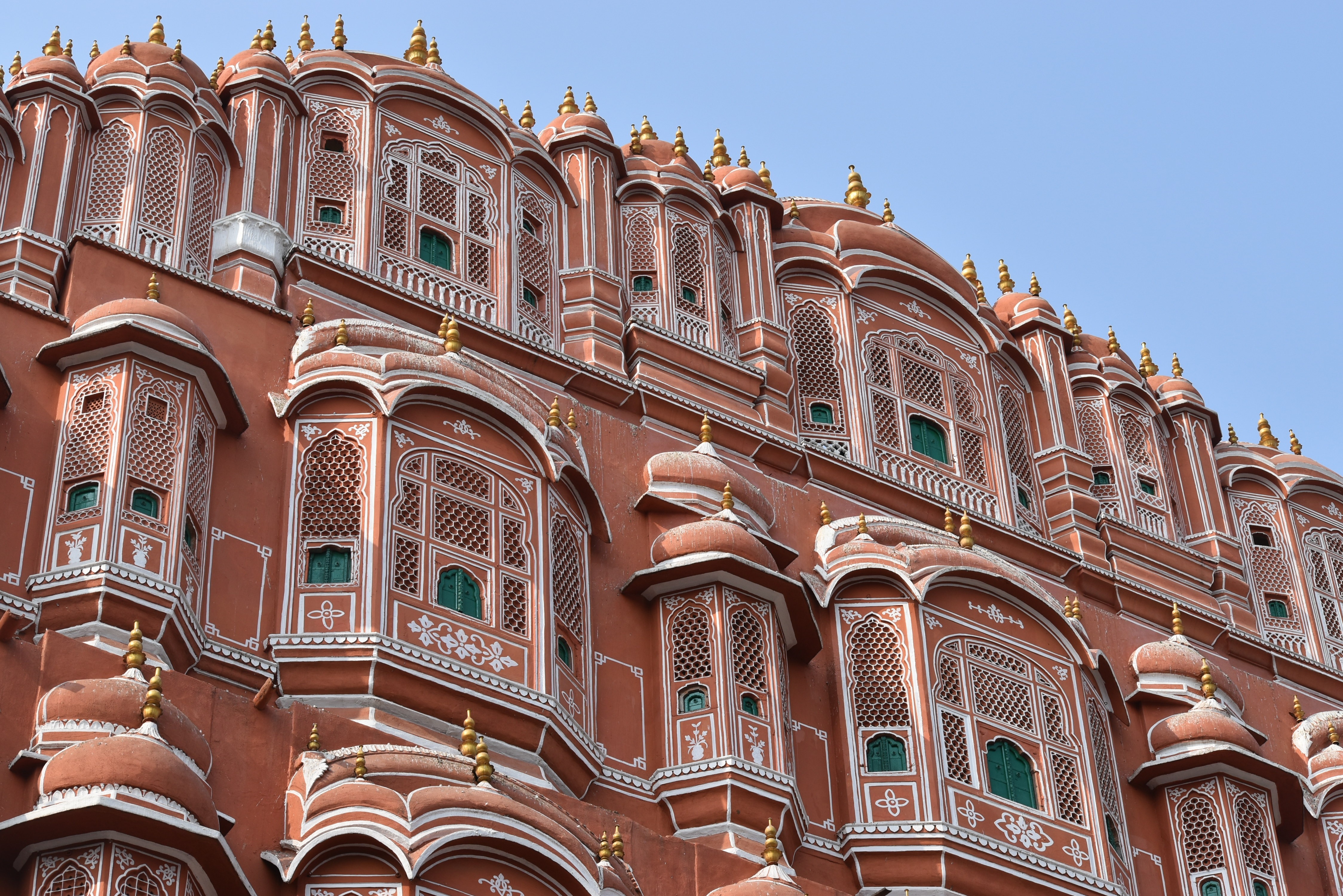 Not wasting any time (since we had an international flight to catch from Delhi that evening – yeah! We are crazy travelers!), we set off on our fort quest right around noon. Our first stop was a fleeting one at the gorgeous Hawa Mahal – its five-floor exterior is akin to honeycomb with its 953 small windows called Jharokhas decorated with intricate latticework, whose main purpose was to allow royal ladies to observe everyday life and festivals celebrated in the street below without being seen since they had to obey the strict rules of "purdah", which forbade them from appearing in public without a face covering.
